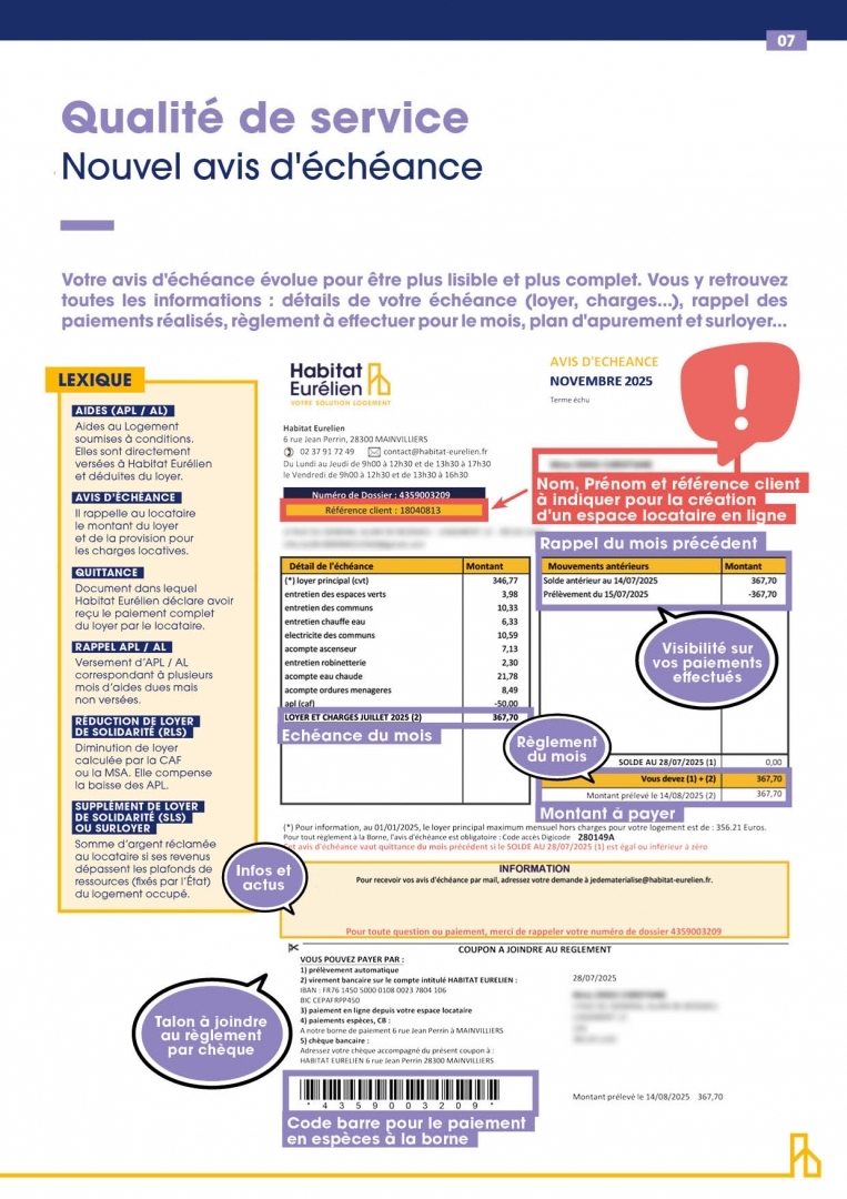 Les locataires y retrouveront toutes les informations : détails de l'échéance (loyer, charges...), rappel des paiements réalisés, règlement à effectuer pour le mois, plan d'apurement, surloyer... et surtout le numéro client (obligatoire pour la création d'un nouveau compte locataire) dans un affichage plus coloré !